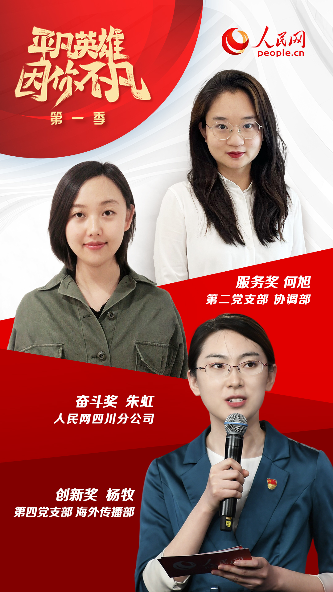 經(jīng)過(guò)激烈比拼,第二黨支部何旭(協(xié)調(diào)部)、第四黨支部楊牧(海外傳播部)、四川分公司朱虹三位同志最終分獲“平凡英雄”服務(wù)獎(jiǎng)、創(chuàng)新獎(jiǎng)和奮斗獎(jiǎng)。同時(shí),第七黨支部董曉偉(網(wǎng)絡(luò)評(píng)論部)、第十一黨支部厲姣(紀(jì)檢監(jiān)察室)、第十三黨支部鄭瀟瀟(移動(dòng)內(nèi)容部)、第二十一黨支部張利娟(人民視聽(tīng)科技有限公司)、安徽分公司李希、山西分公司馬瑩等六位同志獲得“平凡英雄”入圍獎(jiǎng)。