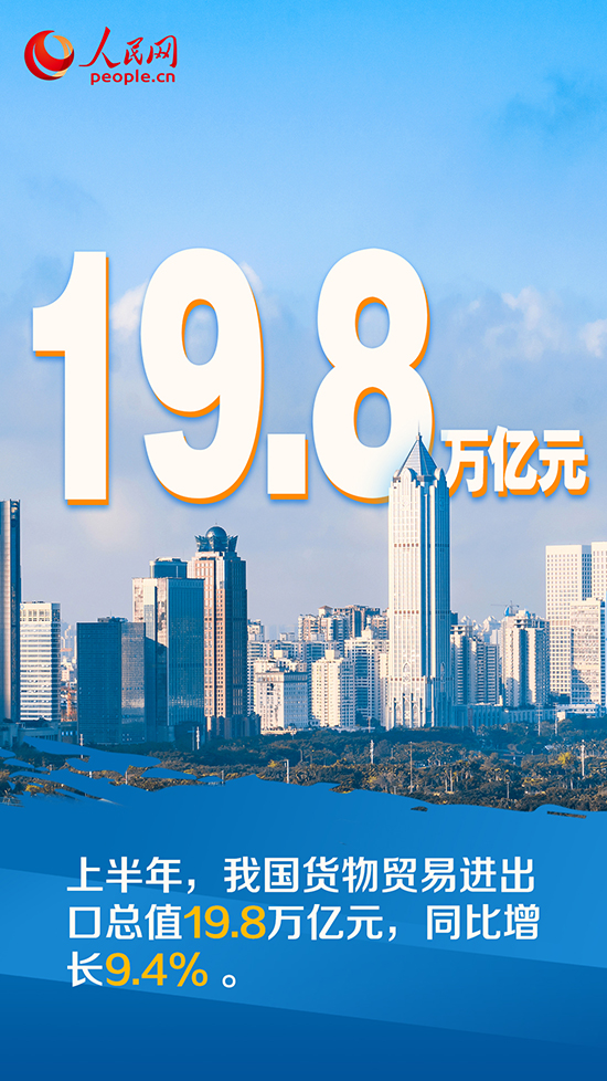 據(jù)海關(guān)統(tǒng)計,今年上半年我國貨物貿(mào)易進(jìn)出口總值19.8萬億元,同比增長9.4%。其中,出口11.14萬億元,增長13.2%;進(jìn)口8.66萬億元,增長4.8%……上半年外貿(mào)進(jìn)出口“答卷”傳遞出我國經(jīng)濟(jì)持續(xù)恢復(fù)的積極信號。