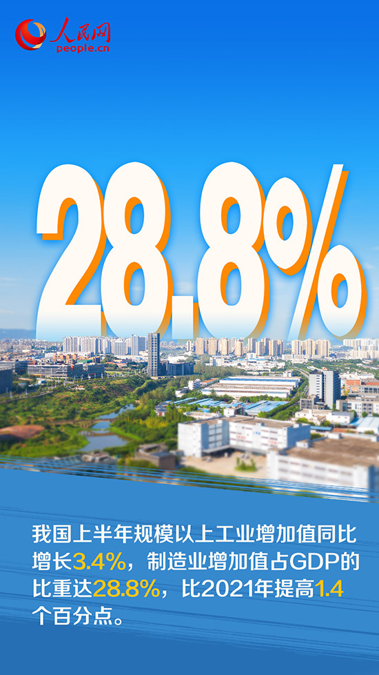 上半年,在各地區(qū)各部門共同努力下,盡管面臨疫情沖擊,產(chǎn)業(yè)鏈供應(yīng)鏈日益穩(wěn)定暢通,工業(yè)經(jīng)濟(jì)迅速扭轉(zhuǎn)了下滑態(tài)勢,實現(xiàn)了恢復(fù)增長。國新辦7月19日舉行發(fā)布會介紹,今年上半年,我國規(guī)模以上工業(yè)增加值同比增長3.4%,規(guī)模以上制造業(yè)增加值同比增長2.8%,制造業(yè)增加值占GDP的比重達(dá)28.8%,比2021年提高1.4個百分點。