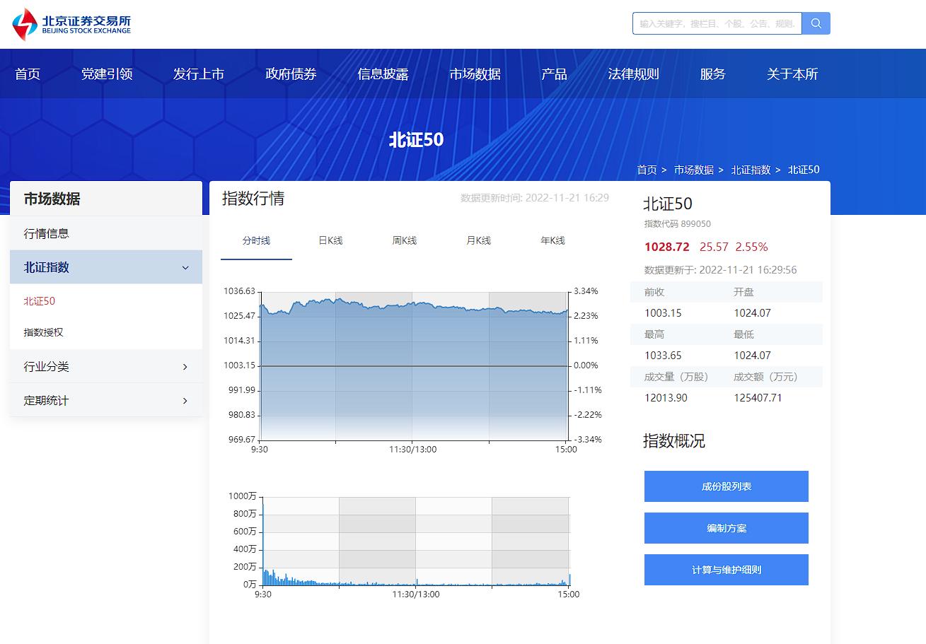 北交所首個指數(shù)——北證50成份指數(shù)(簡稱北證50)于11月21日正式發(fā)布實時行情。上線首日,北證50收盤上漲2.55%,報1028.72點,開盤后走勢平穩(wěn),樣本股成交活躍,提高了整個市場活躍度。據(jù)了解,北證50以2022年4月29日為基日,基點為1000點。