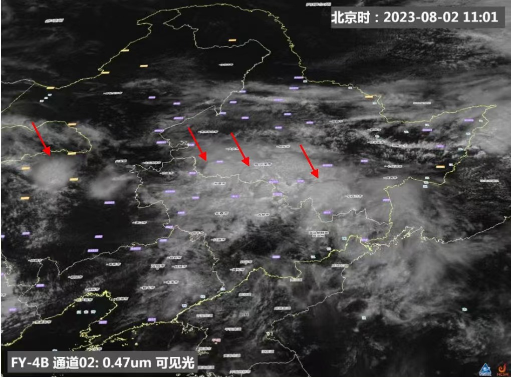 風(fēng)云四號(hào)B星可見光圖像顯示,黑龍江南部、吉林省北部以及內(nèi)蒙古中東部局地的對(duì)流活動(dòng)明顯,出現(xiàn)白亮的上沖云頂。圖片來源:國(guó)家衛(wèi)星氣象中心